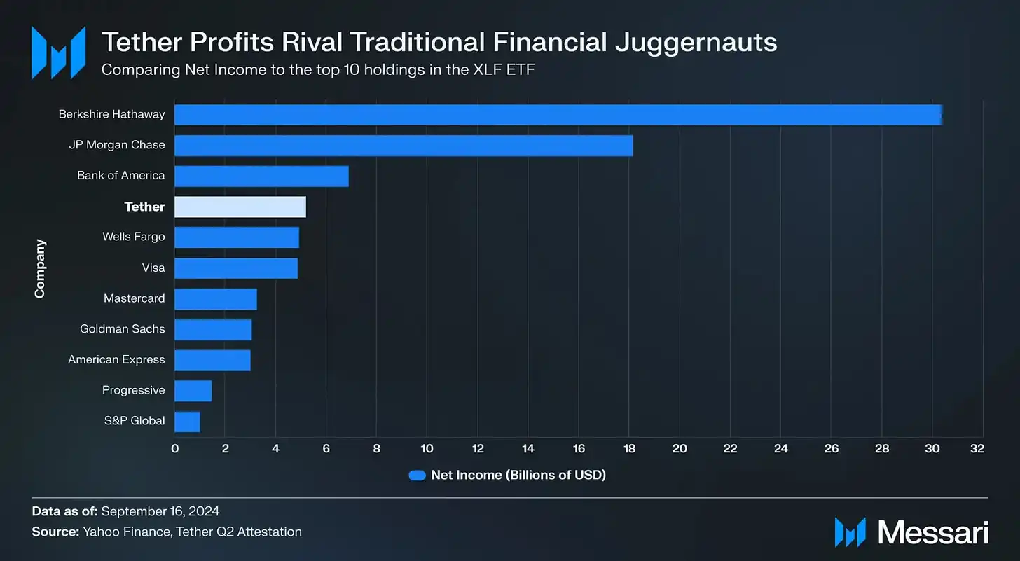 特别是 Tether,因其在金融生态系统中的快速崛起和主导地位,常常与主要的 Web2 金融公司如 JPMorgan、Visa 和 Mastercard 相提并论。在短时间内,它成功超越了许多传统巨头,在市场覆盖率和与加密市场的整合方面取得了领先。