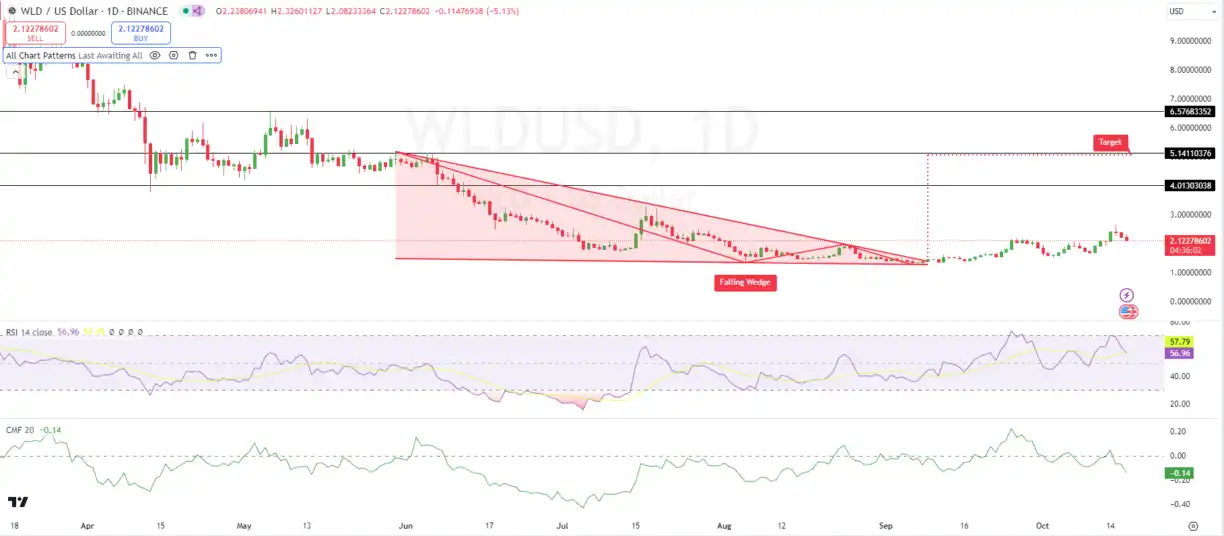 但是从二级技术分析来看,WLD 的相对强弱指数 (RSI) 目前为 56.41,接近 0-100 范围的中点。短期价格处于中性。在中长期 WLD 处于下降楔形之中,有潜在的看涨突破预期。