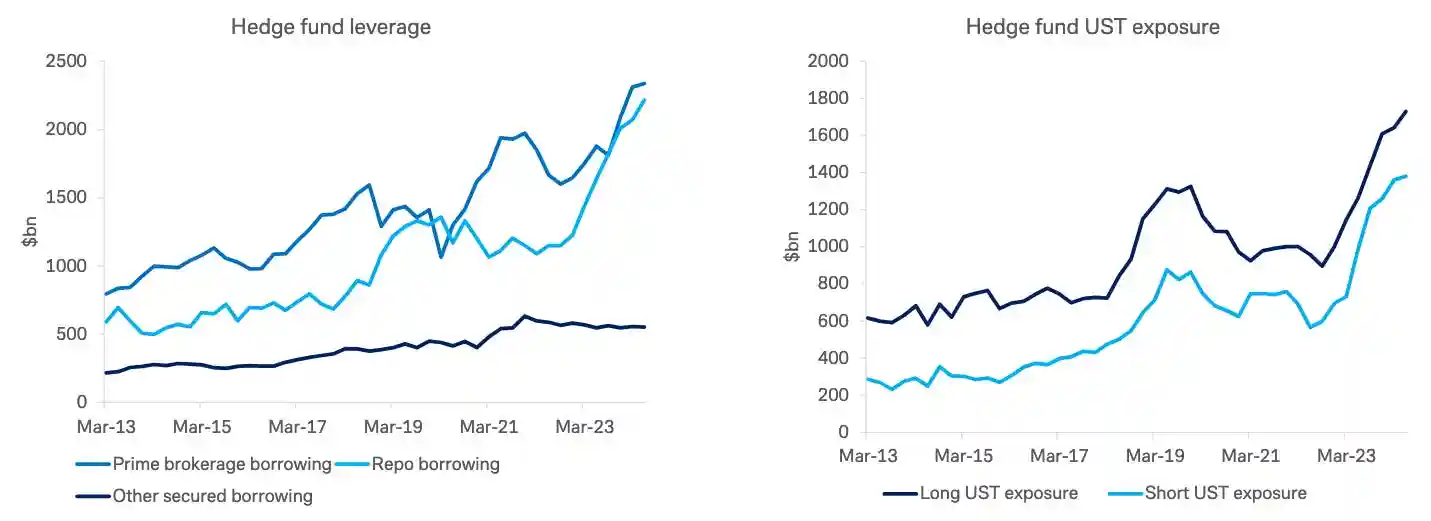 这是来自同一份报告的另一张图表。正如所见,对冲基金正在填补银行购买国债的空缺。但对冲基金并非「真实货币」买家,而是在进行套利交易:他们购买低价的现金国债,同时做空国债期货合约。