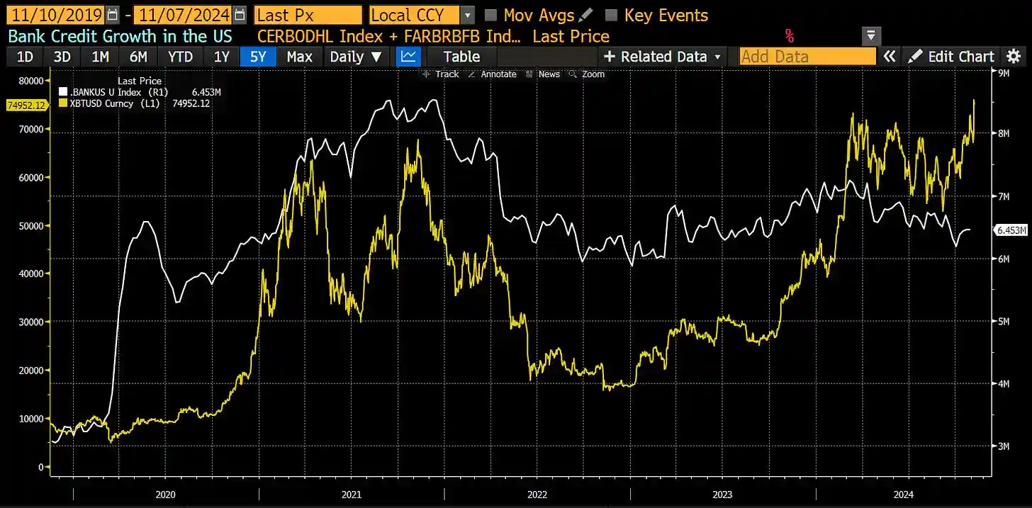 这是我自定义的一个指数,用于跟踪美国银行信贷的数量。我认为,这是最重要的货币供应指标。如你所见,该指数有时会领先比特币,例如在 2020 年;有时则会滞后于比特币,例如在 2024 年。