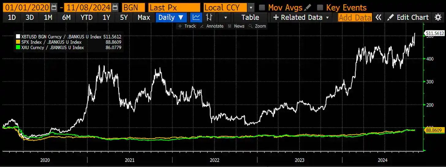 然而,更重要的是,在银行信贷供应缩水时,资产的表现如何。比特币(白色)、标准普尔 500 指数(黄金)和黄金(绿色)都已按我的银行信贷指数进行了调整。这些数值已按 100 为基准指数化,从图表中可以看出,比特币表现突出,自 2020 年以来上涨了超过 400%。如果你只能做一件事来应对法币贬值,那就是选择比特币。这个数学结论是无法反驳的。