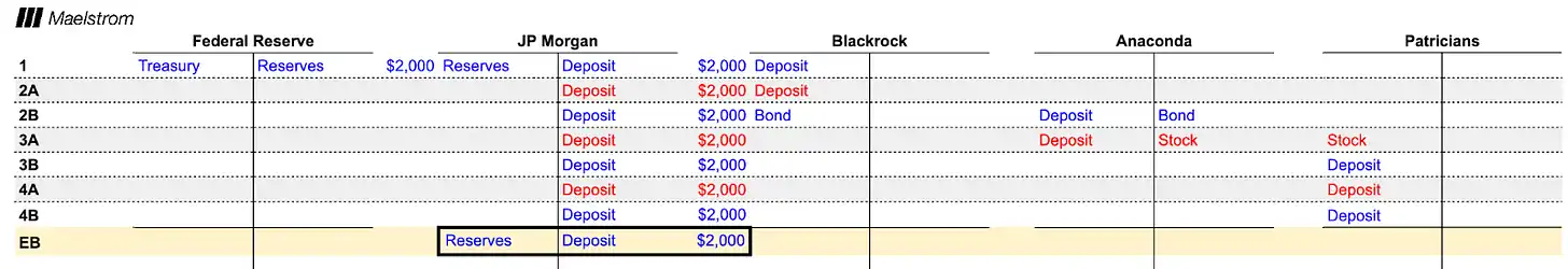 1. 美联储从贝莱德手中购买了 2000 美元的国债,并用储备金支付。摩根大通作为银行在这次交换中扮演了中介角色,获得了 2000 美元的储备金,并为贝莱德记入了一笔 2000 美元的存款。美联储的量化宽松(QE)让银行创造了存款,最终成为货币。