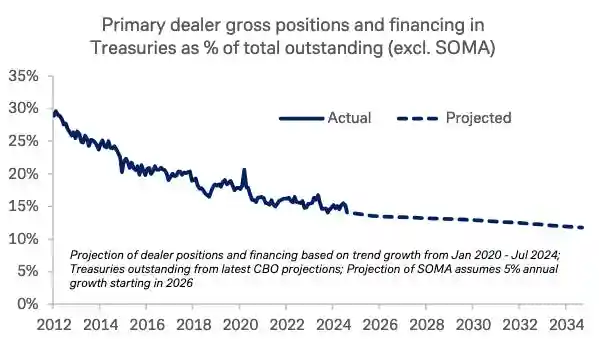 这是美国财政借款咨询委员会(TBAC)在 2024 年 10 月 29 日发布的一份《财政市场财务韧性》报告中的一张图表。图表显示,银行系统持有的国债数量占总发行量的比例正接近最低舒适储备水平(LCLoR)。这是一个问题,因为美联储正在进行量化紧缩(QT),而且一些盈余国家的中央银行要么在抛售国债,要么不再将净出口收益再投资于美国国债(去美元化)。在这种情况下,国债市场的边际买家逐渐变成了一些投机性更强的债券交易对冲基金,其买入行为不稳定。
