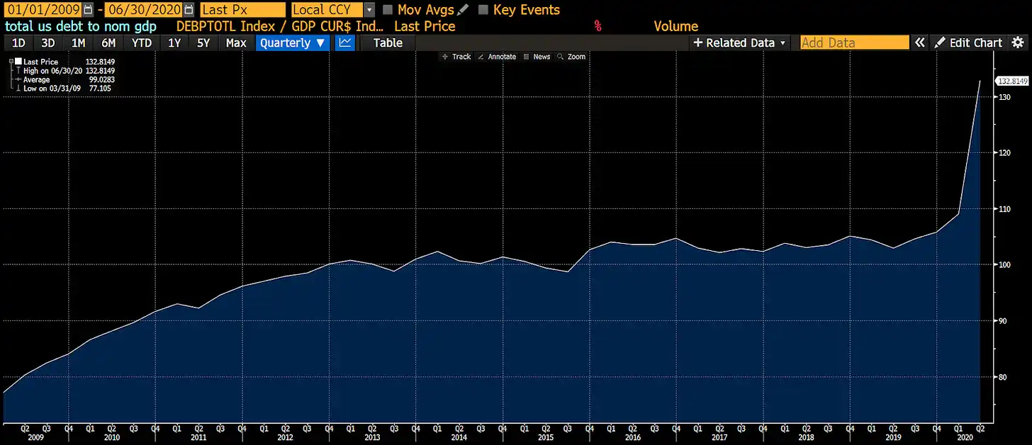 从 2009 年到 2020 年第二季度,是「涓滴经济学」的巅峰期,其资金来源于央行的印钞行动,委婉地称为「量化宽松」(QE)。可以看到,经济的增长速度低于国家债务的累积速度。