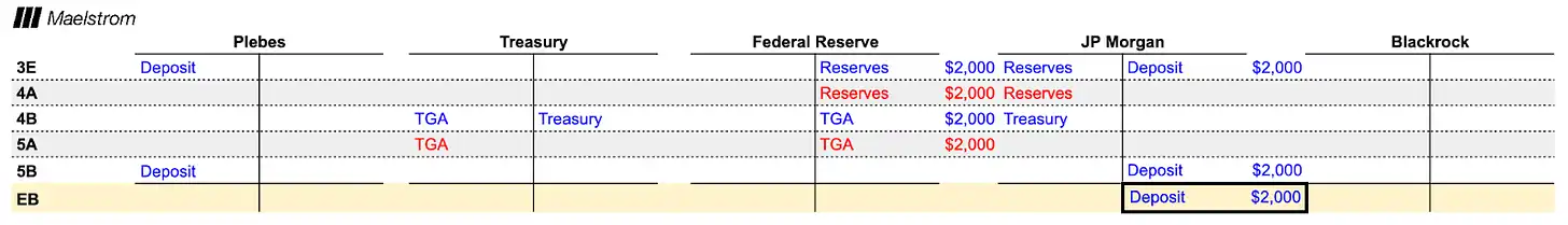 5. 与之前的例子类似,财政部将补助支票寄出,这些补助成为平民在摩根大通的存款。
