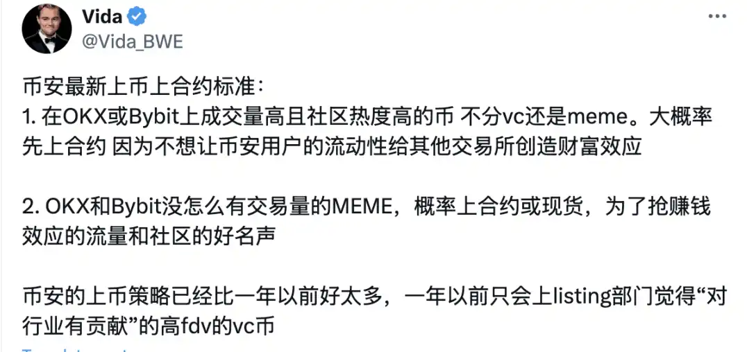 · 在 OKX 或 Bybit 上成交量高且社区热度高的币,不分 VC 还是 Meme。大概率先上合约,因为不想让 Binance 用户的流动性给其他交易所创造财富效应。