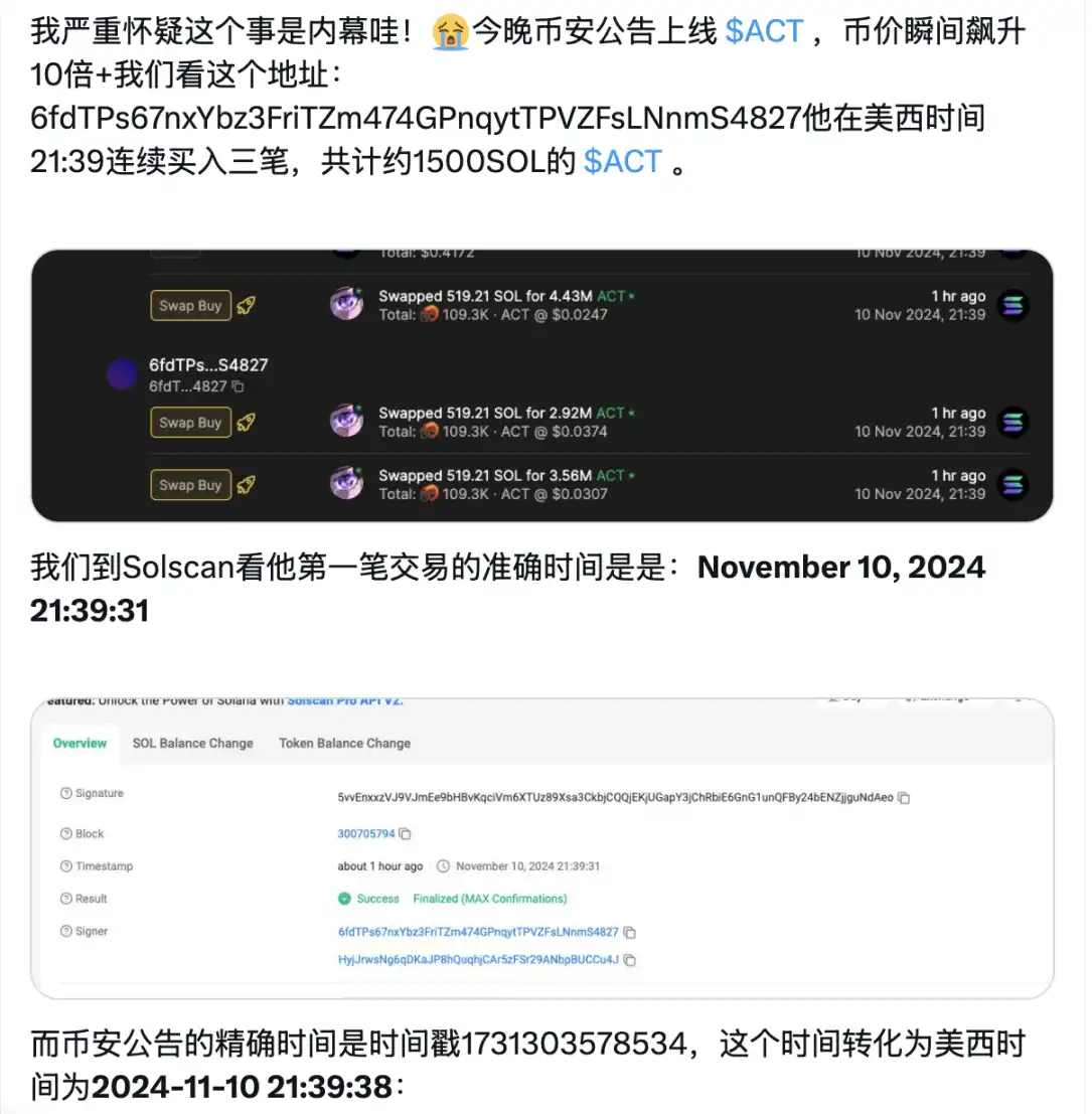 在消息传出前,ACT 代币市值仅为 2000 万美元左右,而上线公告发出后的 8 分钟内,市值直接翻了 10 倍。谁能在第一时间收到消息买入代币,吃到这一段涨幅?