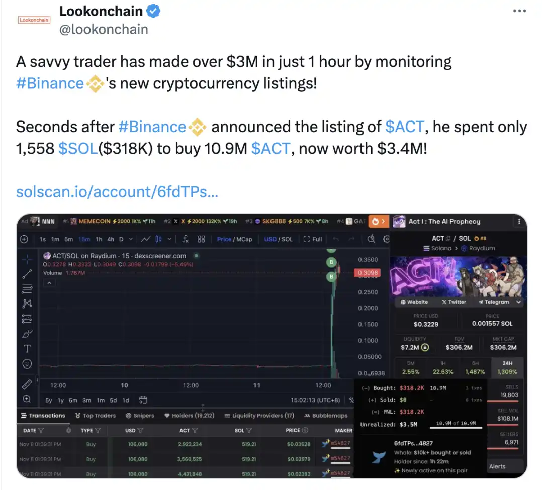 在 Binance 宣布上线 ACT 后的几秒内,他花费 1,558 SOL(约 32 万美元)购买了 1090 万个 ACT,现价值 340 万美元,在 10 分钟内利润超 2000 万人民币!(截止 Lookonchain 发文时)