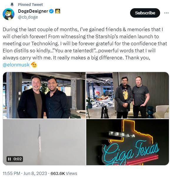 DogeDesigner置顶的6月8日推文中提到:“在过去的几个月里,我获得了将永远珍惜的朋友和回忆。从见证星际飞船的首次发射到见到我们的Technoking,我将永远感激马斯克如此善意地提炼出的信心。”