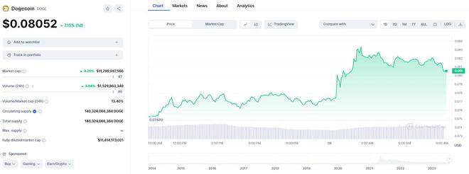 据CoinMarketCap交易图表,狗狗币在发出马斯克转推的瞬间,迅速从0.077美元涨至最高0.083美元,升幅超过10%,周三亚市仍维持在0.08上方交易。