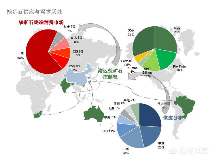 首先我们看一下铁矿石的的全球供应与需求的分布情况,如图:
