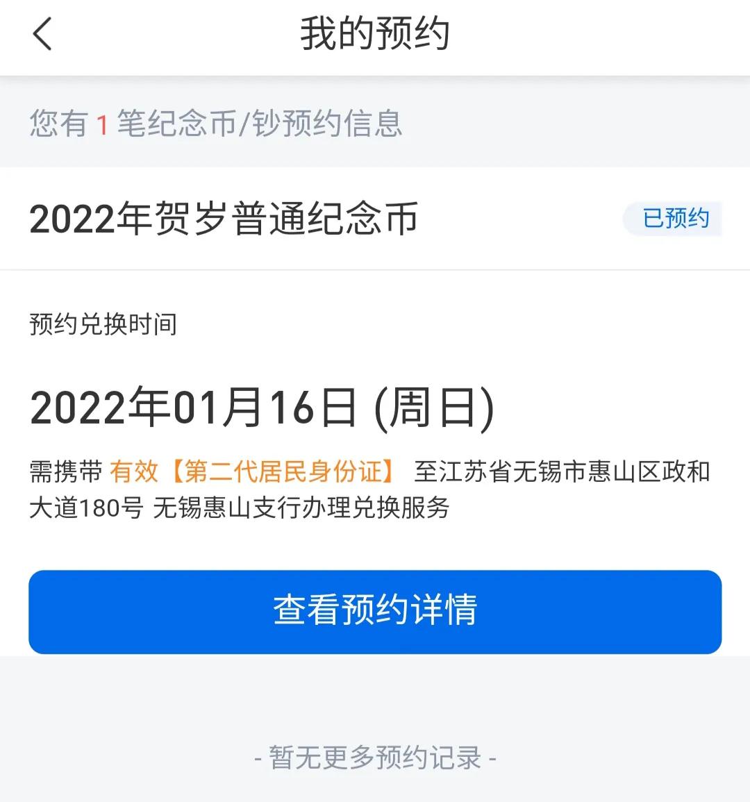 我是在线上预约的,定好了闹钟到点就冲进去,没想到很顺利就约到了,我还觉得意外,心想虎年纪念币也不怎么抢手,后知后觉换了家人的身份信息准备再试试,发现已经没有了!