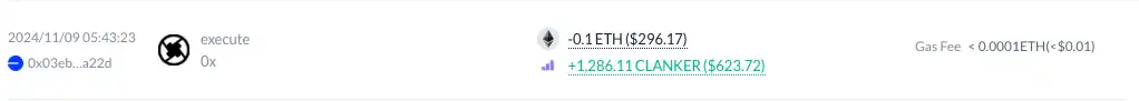 11 月 9 日,mopzy.eth 买入了价值 0.1ETH 的 CLANKER,彼时距离其开盘不到两小时。