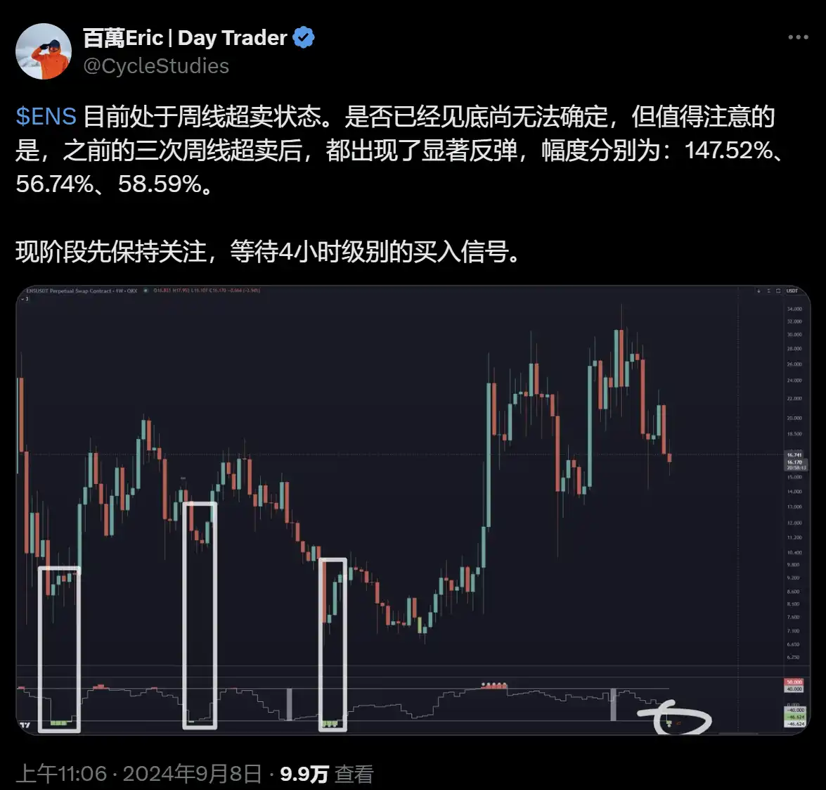 比如说 ENS 这个例子。首先我根据自己的量化工具指标发现了 ENS 出现了周线时间级别窗口的超卖。那过去的几次超卖这个价格分别反弹了 147%、56.74% 以及这个 58.59%。那在过去这段牛市 ENS 从 9 美元到了 30 美元的价格,所以 ENS 进入了我的视线范围。