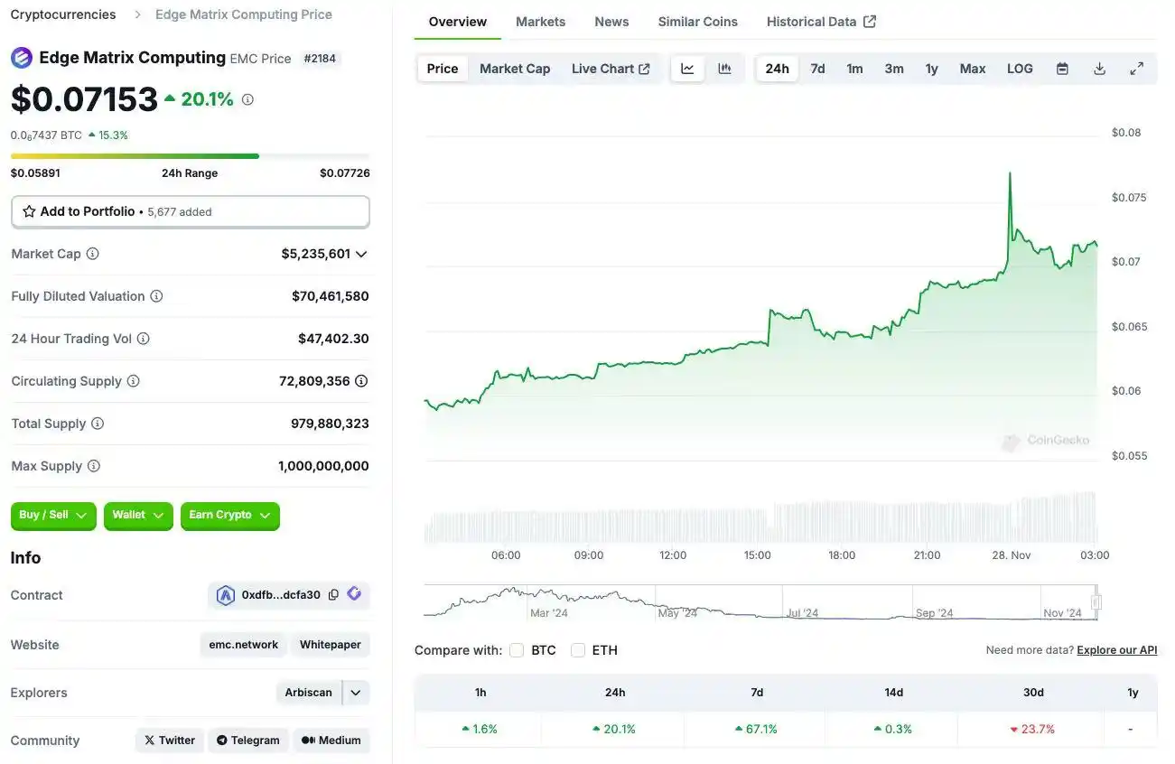 在这样的背景下,一个拥有 GPU 创新,还基本上涵盖了现在市场上你能想到的 AI 用法和玩法: Layer 1、算力租聘、去中心化 AI Web3 创作平台以及 AI 代理的项目——Edge Matrix Chain,可以算是一个非常好的埋伏标的了,甚至是个价值洼地了。