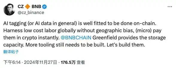 出狱不久的 CZ 也非常关注 AI,他最近的推特也谈到了 AI 和区块链结合的潜力:「AI 标记(或 AI 数据处理)非常适合在链上完成。它能利用全球低成本劳动力,消除地域偏见,并通过加密货币即时支付。」与此同时,马斯克也宣布了 xAI 将创办一个 AI 游戏工作室,目标是「让游戏再次伟大」。