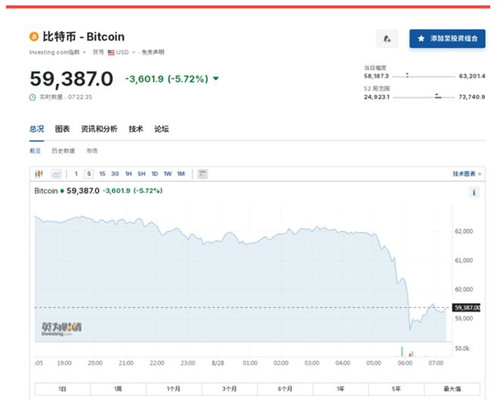 截至8月28日发稿,比特币报59387美元,跌幅5.72%。