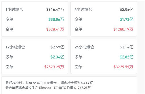 coinglass数据显示,24小时,加密币全网共85670人爆仓,3.14亿美元(约合人民币22亿元)蒸发。