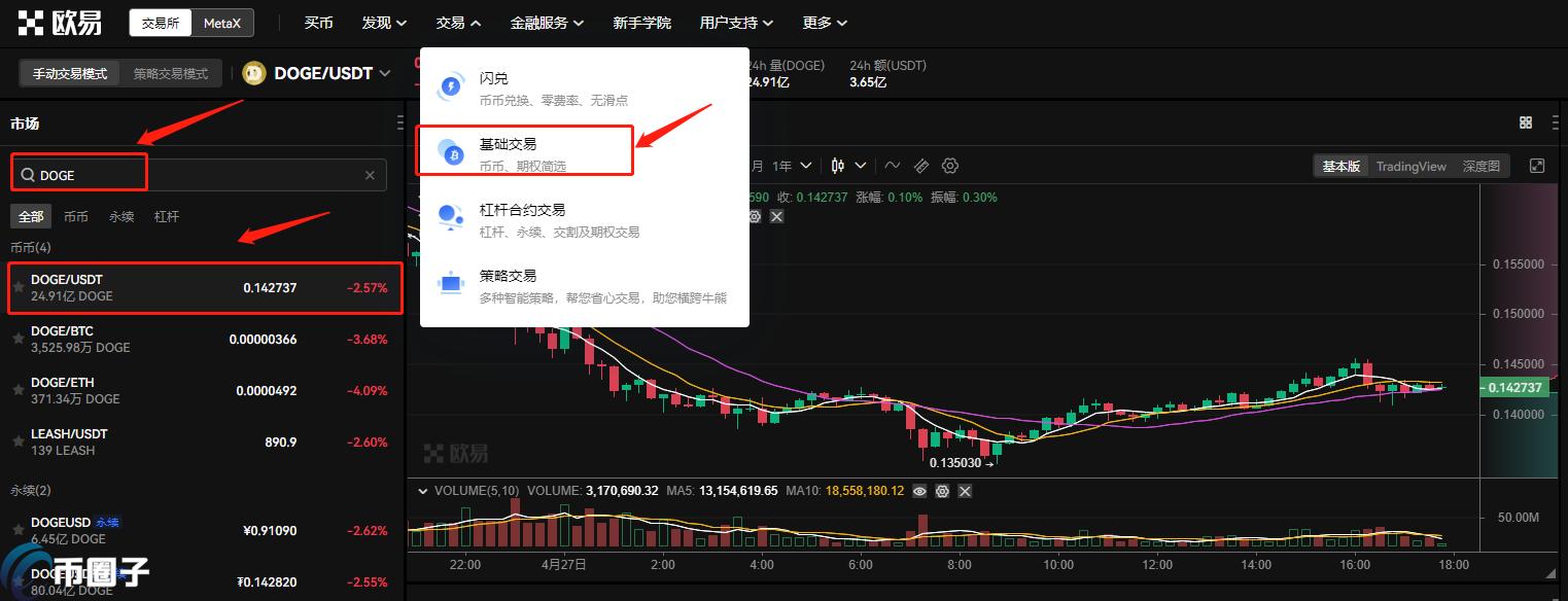 4.在首页点击“基础交易”页面,选择想要交易的币种,本文以卖出DOGE狗狗币交易为例,选择“DOGE/USDT”交易对