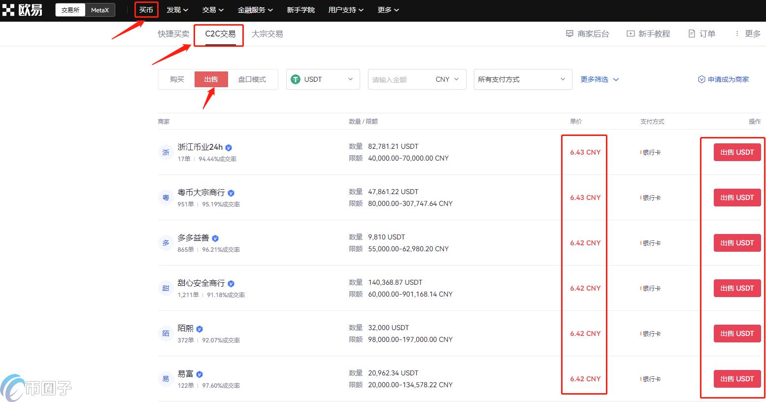7.确认后,点击“买币”,选择“C2C交易”,点击出售即可卖出USDT进行变现。