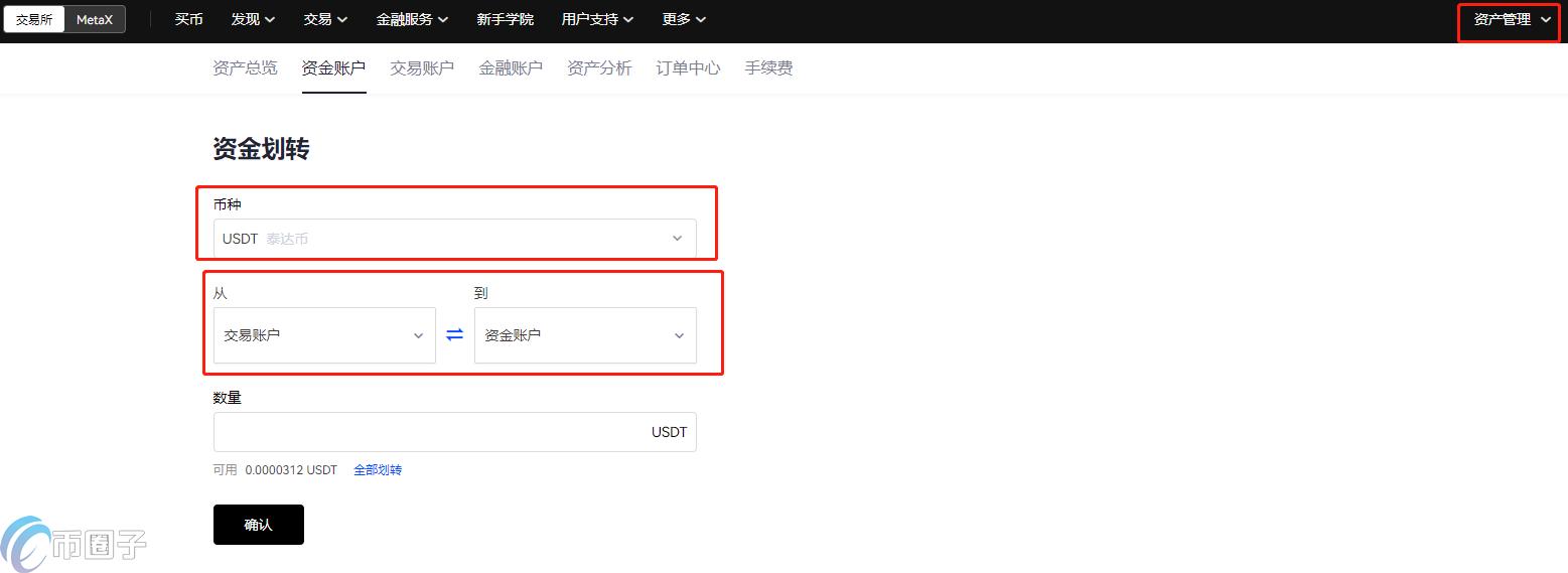 6.点击右上角资产管理“资金划转”,选择USDT从“交易账户”划转到“资金账户”输入“划转数量”点击确定。注:点击箭头方向可直接切换划转方向
