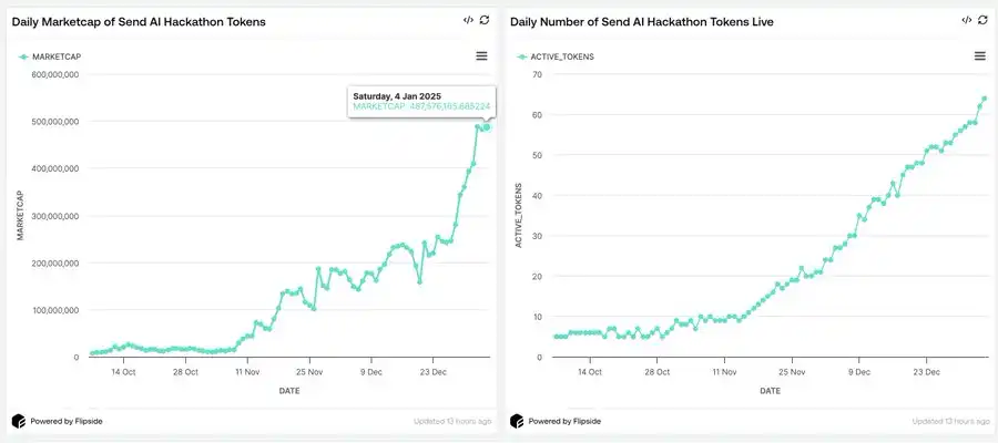 但我们万万没想到,这会变成一场投机者的赌博竞技场。举个例子,仅 solanaaihackathon.com/projects 页面在一周内就吸引了超过 4 万名访客。现在每天都有 2-3 个黑客松项目发行价值 5000 万美元的代币,总价值已超过 5 亿美元。无意间,Solana AI Hackathon 已经成为了一个 AI 代币发现平台。