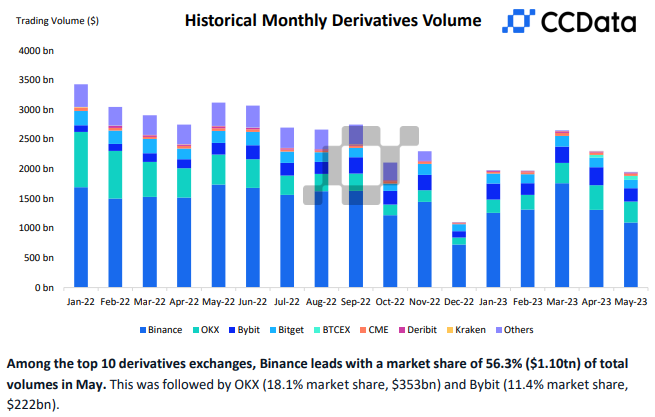 据CCData的4月数据,顶级交易所占现货交易量72%,相较于CCData最新的4月数据74.2%也有下滑。