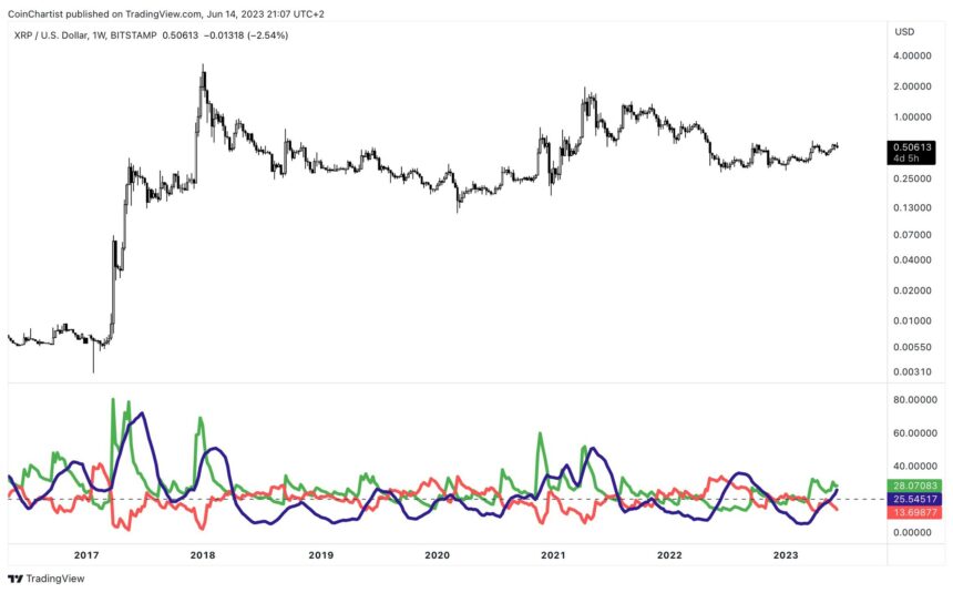XRP 仍处于与美国证券交易委员会的法律纠纷的中心,但技术面可能指向此案的积极结果。这是根据平均方向指数得出的,该指数在每周时间框架内显示出增强的看涨趋势。