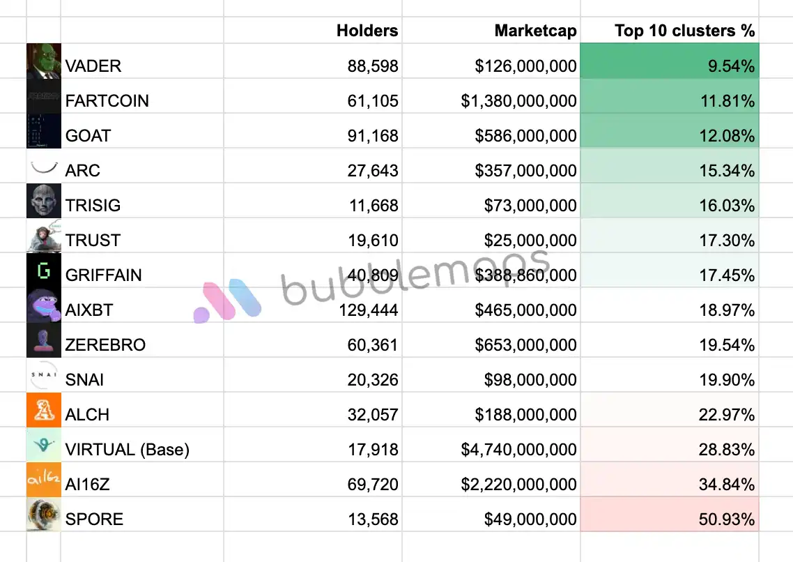 六大AI代币持仓集中度分析:SPORE超50%,FARTCOIN分布较为均衡