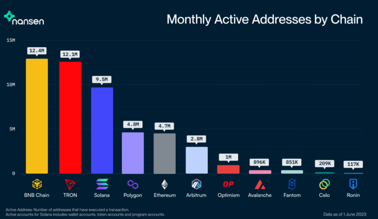 不过虽然在五月以来,加密市场面临了极大的监管压力,Nansen的统计数字却出现了令人难以置信的结果,五月份在链上的月活跃地址都大幅增加: