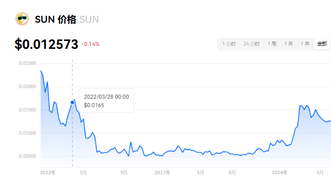SUN 当前价格为 $0.012573。SUN 的价格在过去 24 小时内下跌了 -0.13%。目前,SUN 市值排名为第 180 名,实时市值为 $1.24亿,流通供应量为 9,822,285,972 SUN,最大供应量为 19,900,730,000 SUN。我们会实时更新 SUN/USD 的价格。SUN 价格表现 (美元)