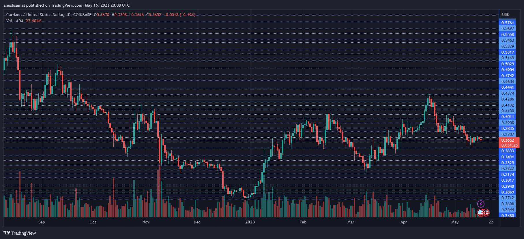 目前卡尔达诺 (ADA) 的价格为 0.367 美元。在过去的 24 小时内,ADA 的价格下跌了 1.3%,而周线图上没有任何明显的变动。ADA 的关键阻力位在 0.37 美元,这已被证明是多头最近几周未能突破的强大障碍。