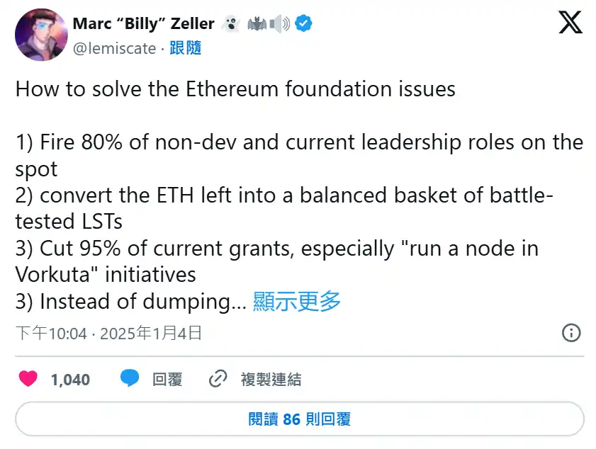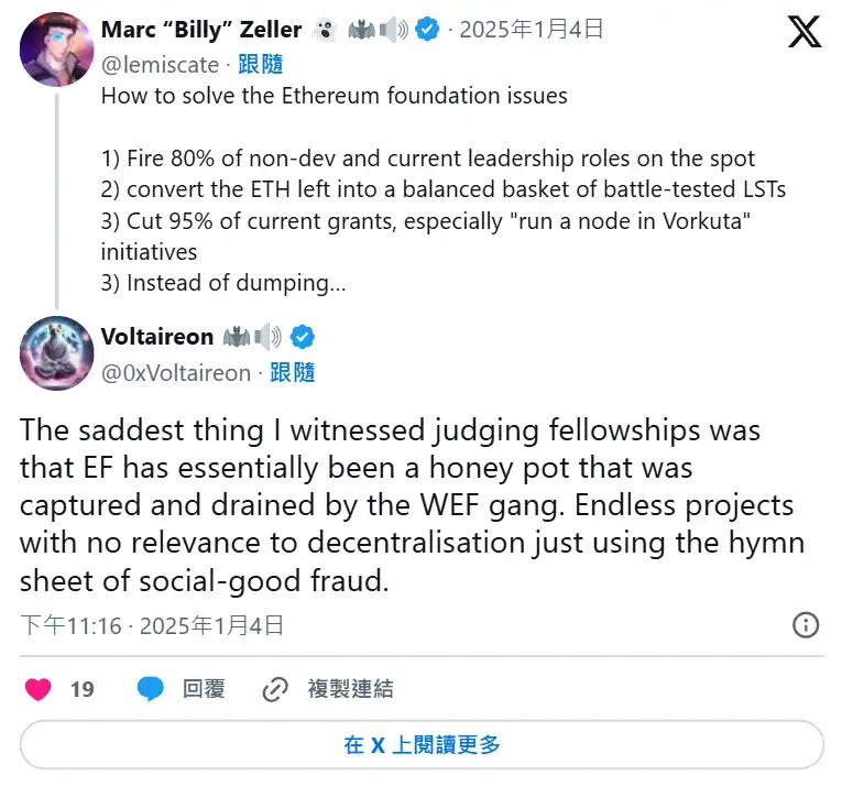 该贴文一出后,就引起了广大的讨论,其中围绕著为何以太坊基金会不是借贷协议的方式来处理基金问题,有社群就提及,以太坊一直以来不想要站队任何 Defi、LST 协议,但是维护 Danksharding 、与 beamchain 却花上了 20 亿美元,却不愿意在行销上花半毛钱,这应该是需要协调的地方,不然就应该解散。而过去曾参与 Gitcoin 奖金审查的社群成员 @0xVoltaireon 也同步开炮,他认为以太坊基金会只是个放满钱的晃子: