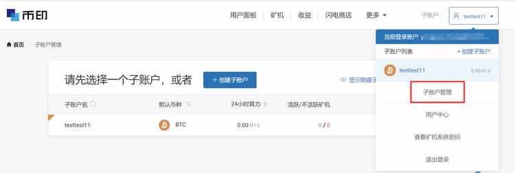 矿池网页:登录矿池网页www.poolin.com——点击创建子账户——设置子账户名称——选择优先显示的币种——填写收款地址