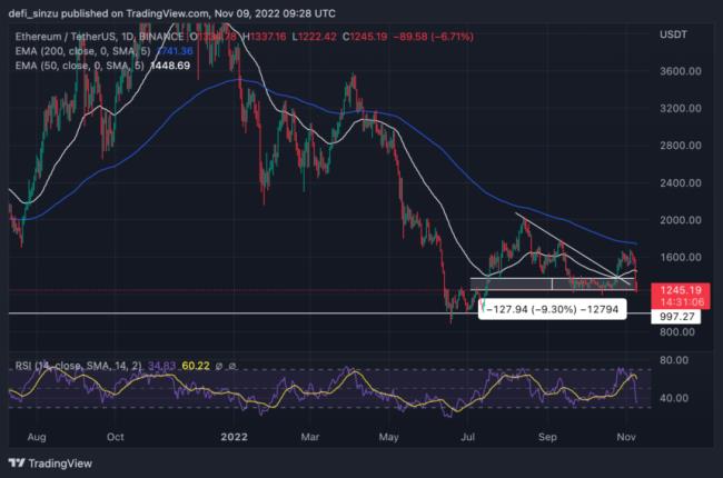 前几周,以太坊(ETH)和大多数山寨币的价格呈上涨趋势,因为许多人产生了超过 200% 的涨幅,其中包括以太坊(ETH)的价格从 1,300 美元的区域上涨至 1,600 美元的高位,许多人希望 ETH 的价格上涨将在 2,000 美元区域拉动良好的价格走势。尽管如此,围绕加密市场的不确定性还是打断了这些预期。由于当前币安和 FTX 之间的市场问题,ETH 的价格看起来疲软,这给大多数交易者和投资者带来了对不确定性和怀疑的恐惧。