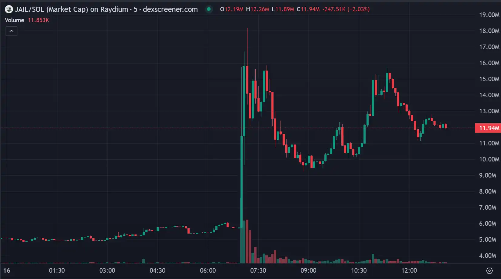 根据 Jail 代币的 24 小时交易数据显示,今日最高涨幅一度飙升至 219.51%,市值触及 1672 万美元,展现出较冠亚军更为猛烈的增长势头。然而它同样未能突破前高。目前市值回落至 1194 万美元,交易量保持在 1250 万美元。