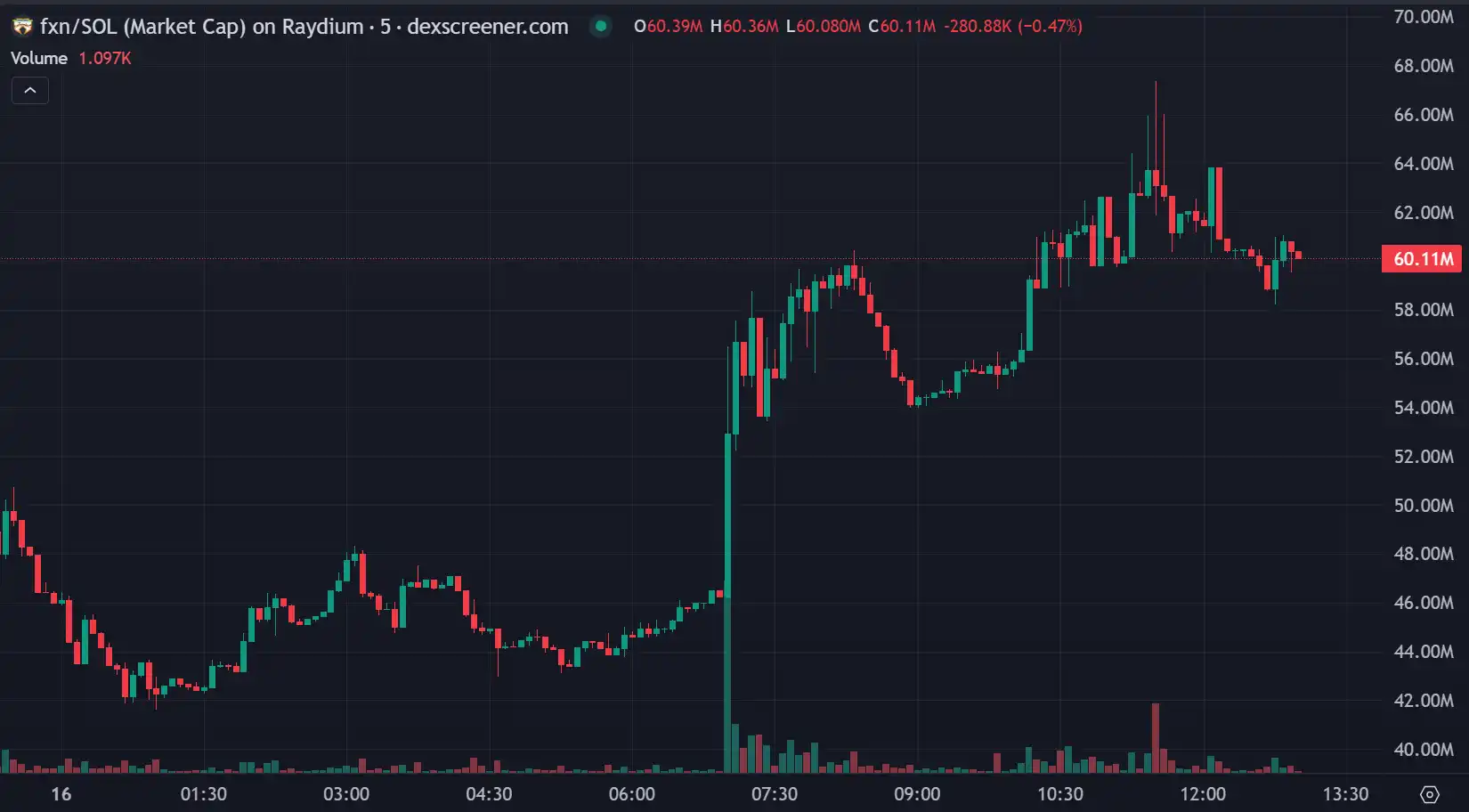 根据 FXN 代币的 24 小时交易数据显示,今日涨幅最高达到 55.72%,市值一度触及 6744 万美元,也是未能突破前高,目前交易量为 480 万美元,市值稳定在 6011 万美元。与冠军 BUZZ 相比,FXN 的涨幅稍逊一筹。