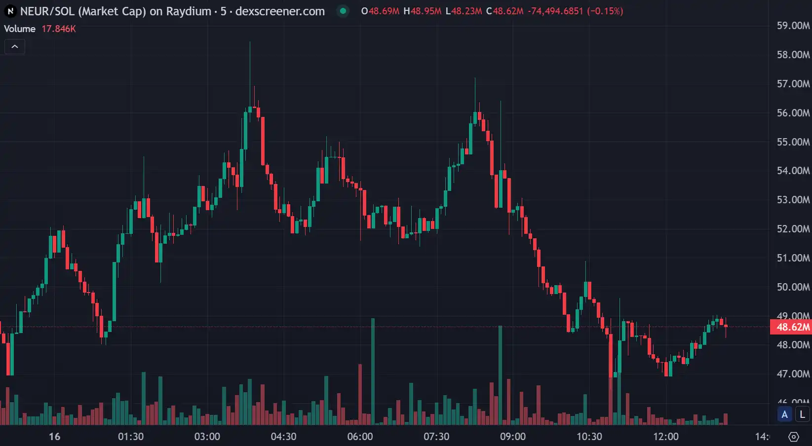 再来看 Neur 代币的 24 小时交易数据,并没有呈现和前三名一样的涨幅趋势,尽管在 Solana AI 黑客松消息公布后,Neur 短暂上涨 10.21%,但随即回落。目前市值下降至 4862 万美元,交易量保持在 800 万美元左右。
