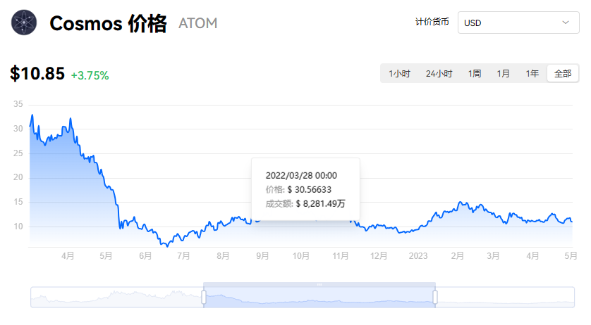Cosmos 当前价格为 $10.85。Cosmos 的价格在过去 24 小时内上涨了 3.75%。目前,Cosmos 市值排名为第 25 名,实时市值为 $41.39亿,流通供应量为 3.83亿 ATOM,最大供应量为 3.83亿 ATOM。我们会实时更新 Cosmos/USD 的价格。Cosmos 价格表现 (美元)