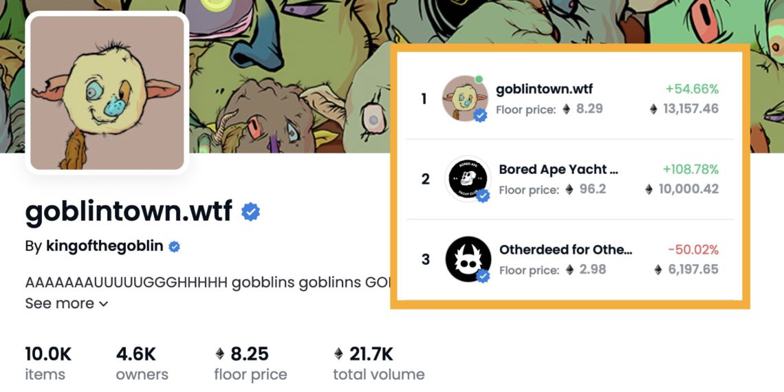 刚上映不到两周,妖精镇。WTF(妖精镇。WTF)凭借创造性的模因营销技术已经成为一个热门市场。根据Opensea的最新数据,这个项目的楼面价已经达到8.25ETH,七天交易量累计13,157ETH(现价约2370万美元),位列Opensea第一,甚至比第二蓝筹NFT BAYC高出30%。
