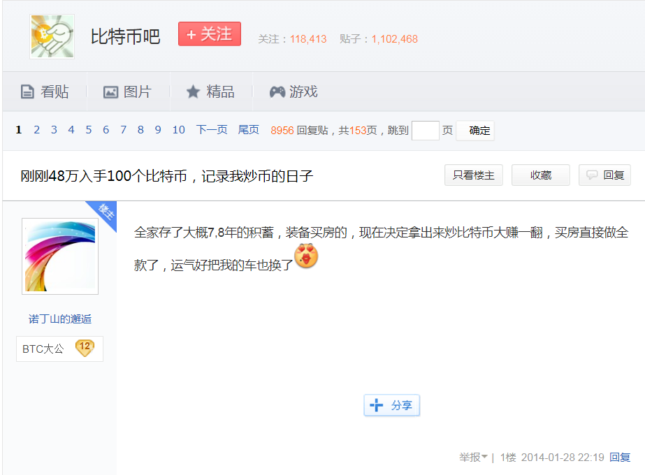 百度比特币贴吧上留有一个传奇帖文,楼主诺丁山的邂逅在2014年把全家7、8年的积蓄和买房款48万全部买入100个比特币,准备大赚一番,但最终在亏损近20万后割肉出局,只是帖子直到现在每天仍有人在留言追问后来怎么样了?楼主卖了吗!其中一个最新跟帖网友的故事是,在历史高价3块多,重仓买入了66000多个山寨币行云币,而该币最新价格不到0.3元,一度低至0.16元,希望有解套的那一天。