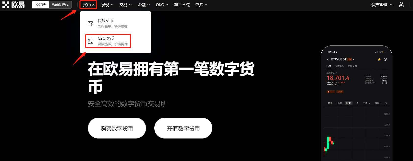 3.注册以及认证完成之后即可进行交易,在首页点击【买币】进入【C2C买币】页面