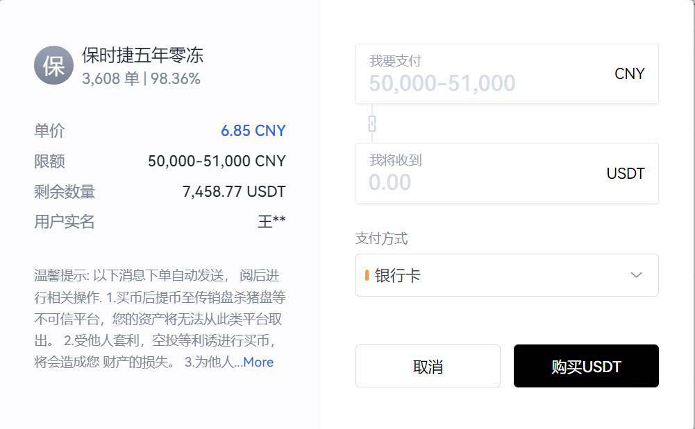 5.在弹窗中输入购买金额,点击【购买USDT】获得付款方式,向对方付款,等待对方放币即可