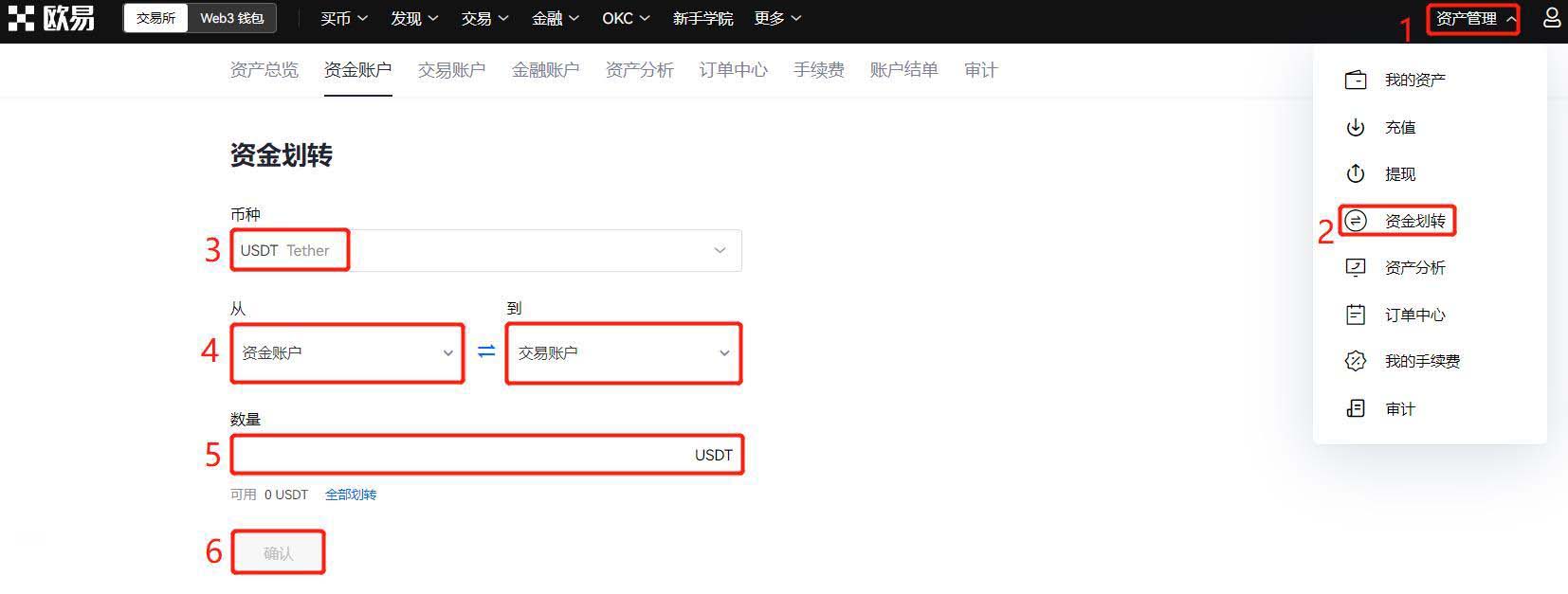 6.购买的USDT将会储存在资金账户,想要进行交易需要划转到交易账户,找到右上角的【资产管理】点击下方的【资金划转】,选择币种USDT,输入数量,点击确认即可