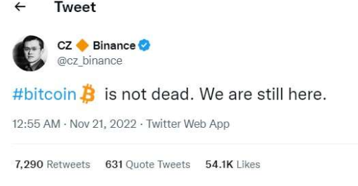在比特币下挫之际,币安执行长赵长鹏今日发推信心喊话「比特币没有死,我们还在这里」,MicroStrategy 执行董事主席Michael Saylor 也回应「比特币是一个不朽的、不可摧毁的、不可腐蚀的基础,在此基础上可以建立一个更美好的世界」。
