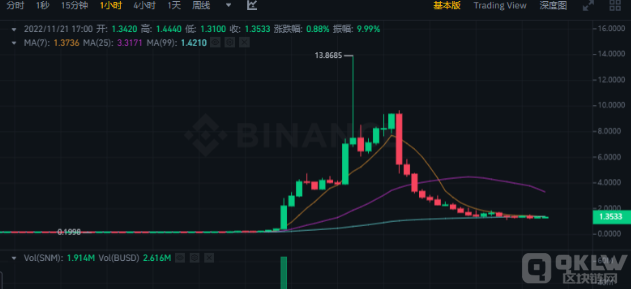 20 日早,在SONM 官方无任何动向与公告的情况下,SNM 在早上无预警飙涨,一度在10 点30 半站上4.57 美元新高价格,涨幅高达2,814%。