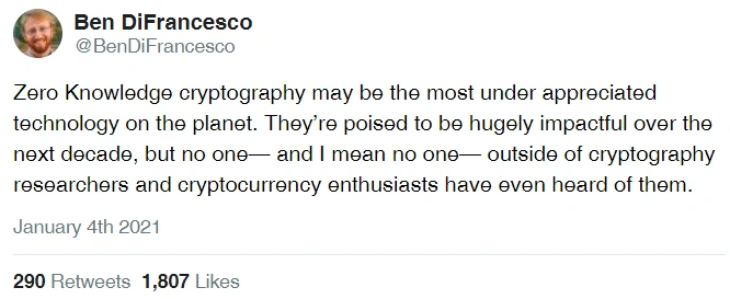 在加密货币的世界中,上述互动方式已经成为可能。今天有一些项目致力于使用 ZKP 来证明交易者的信用评分。还有一些项目正在为面向 ZKP 的资产和交易建立新的、通用的平台。还有一些人仍然专注于将基于 ZKP 的隐私带到以太坊。以太坊创始人 Vitalik 认为:“零知识证明是最强大的隐私解决方案,尽管技术实现难度最高,但在保护以太坊网络的隐私性和安全性上,效果最佳。”