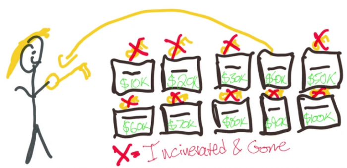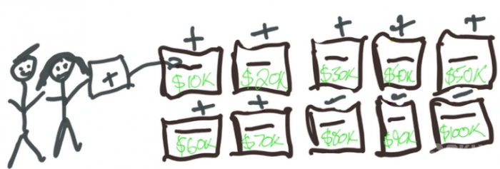 中介设置了 10 个信箱,分别标记了从 1 万美元到 10 万美元的 10 个整数,每个信箱上都有一个钥匙和一个插槽。中介将这 10 个信箱放进房间的同时,毁掉了其中 9 个信箱的钥匙,然后只拿走了标有 4 万美元信箱的钥匙。