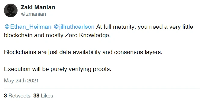 区块链利用 ZKP 来解决这个问题。整个交易历史可以压缩到一个单一的证明,只需要验证证明,而不需要验证整个账本。该证明的尺寸不会超过几条推文,任何人的硬件设备都可以完成。
