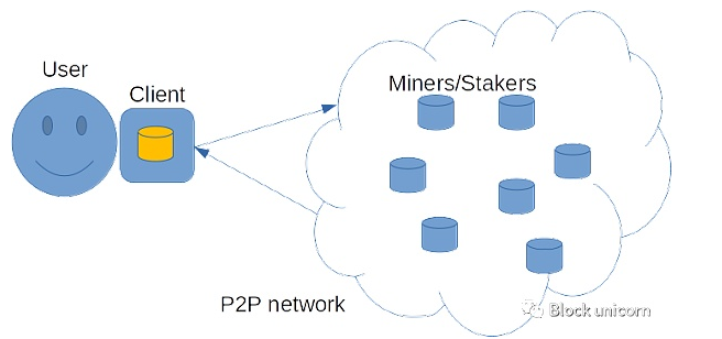 重要的部分是用户正在运行一个完整的节点,如其客户端中的圆柱体所表示的那样。每当客户端获得一个新块时,就像任何其他节点一样,无论是矿工还是 P2P 网络中的一个节点,他们都会验证该块是否是有效的状态转换。